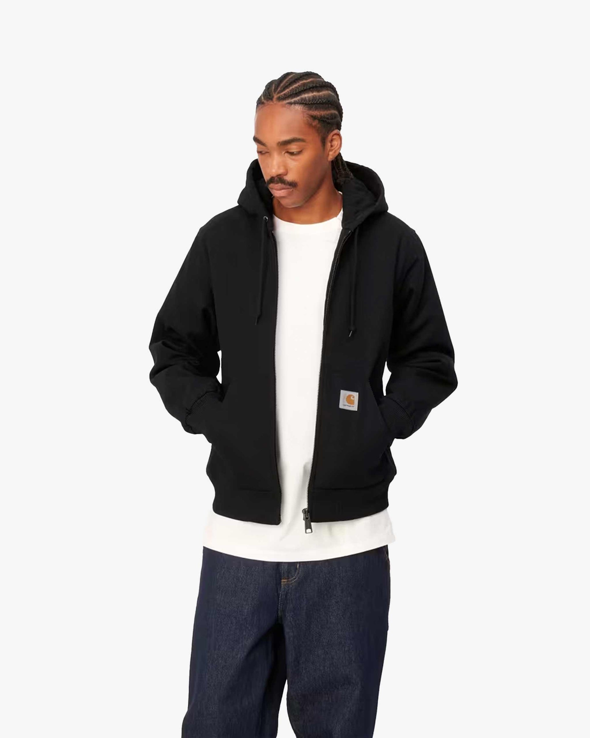 La Active Jacket está confeccionada en lona Dearborn Canvas de algodón, un tejido resistente y tratado para repeler el agua. Incorpora forro aislante 3M Thinsulate™, que ofrece calidez sin añadir peso, manteniendo la transpirabilidad. El interior del cuerpo presenta microforro polar acolchado con dibujo de rombos, mientras que las mangas están forradas en nailon para facilitar el movimiento. Incluye capucha ajustable, puños y bajo de canalé, y un bolsillo tipo canguro. Una etiqueta cuadrada tejida completa el diseño.