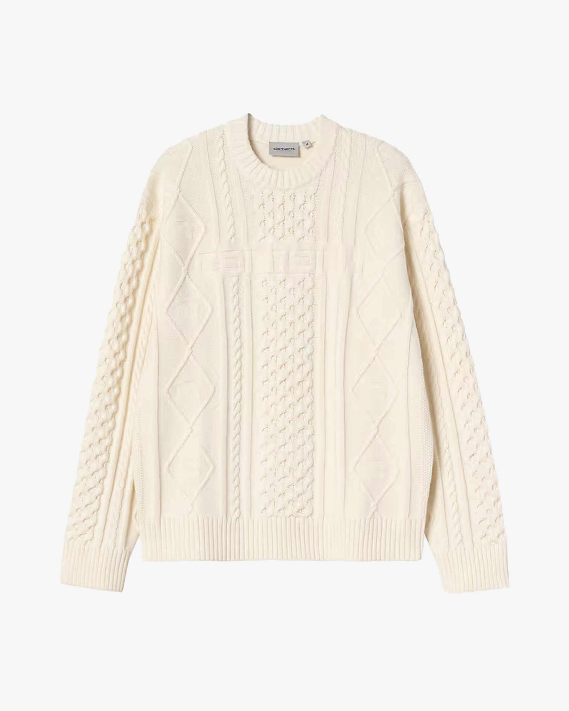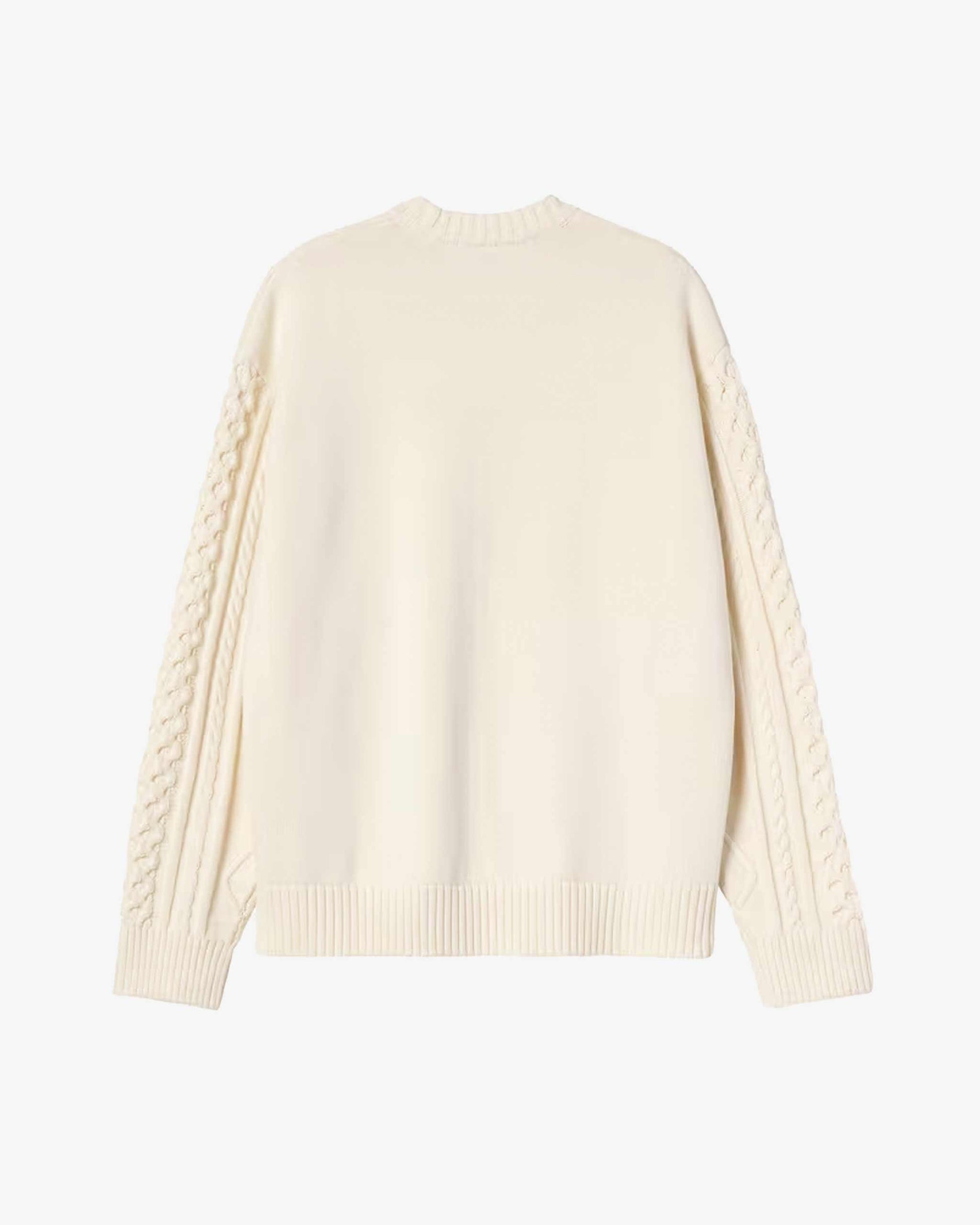 El Shawn Sweater está confeccionado en una mezcla gruesa de algodón e hilo acrílico, ofreciendo estructura y comodidad. Presenta un diseño de punto de ochos en el frontal y las mangas, junto con un logotipo de texto tejido en jacquard en el pecho.