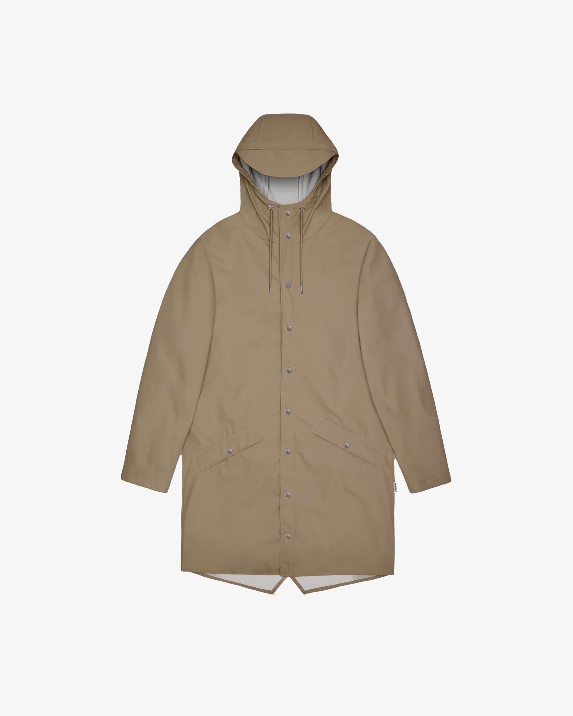 La Long Jacket es un impermeable unisex con diseño atemporal y corte largo, definido por su silueta minimalista. Esta prenda, versión extendida del clásico chubasquero de Rains, incluye tapeta con botones de presión, capucha con visera incorporada y bolsillos laterales con cierre a presión. Las mangas ajustables mediante botones permiten un fit suelto o más recogido.